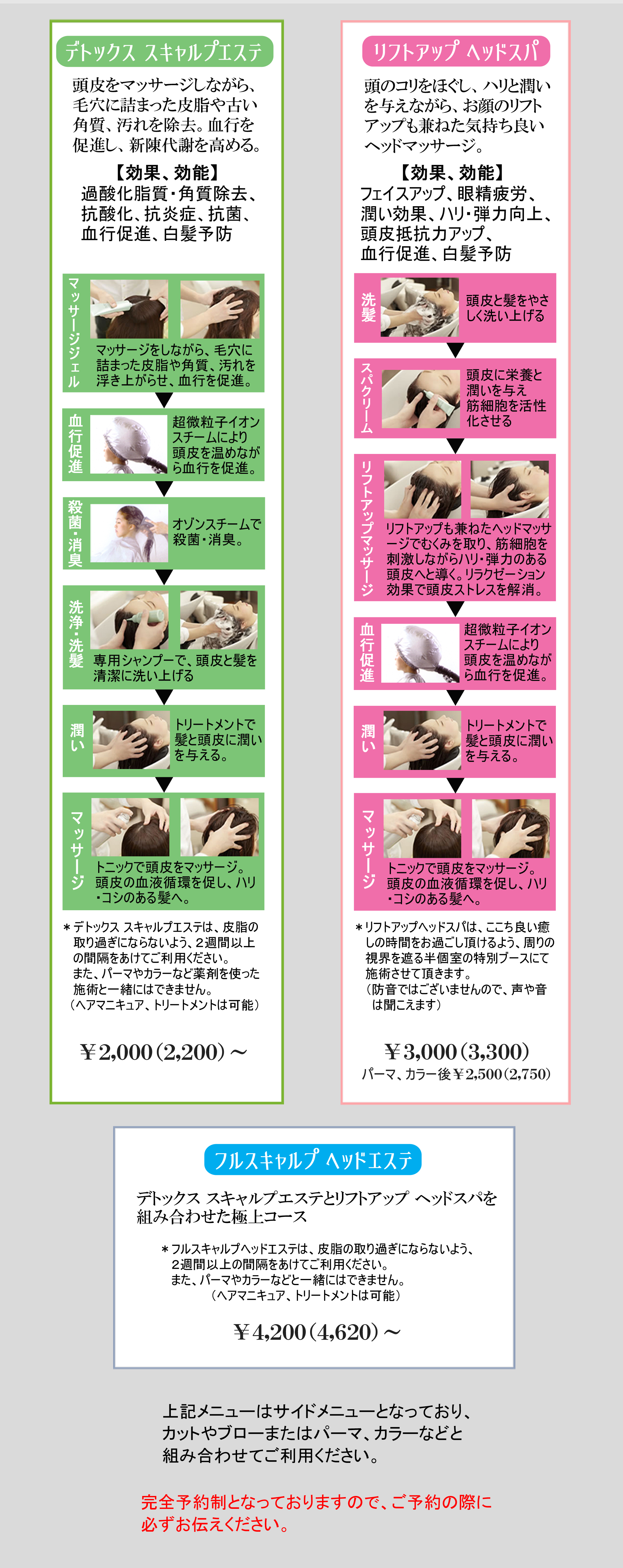 あなたの頭皮、くたびれていませんか?健康な髪を育むには、健康な頭皮をつくることが大切です。 毛穴に詰まった皮脂汚れや角質などは健康な頭皮をつくる妨げとなります。普段の洗髪では、きれいに取り切れない毛穴に詰まった皮脂汚れや角質を取り除いてすっきりしませんか?そして頭には多くのツボがあり、刺激を与えることで頭のコリや眼精疲労にも効果的です。また、たるんだ頭皮を引き締めることでお顔のリフトアップにもなります。